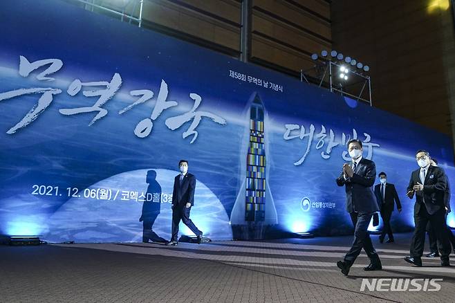[서울=뉴시스] 전진환 기자 = 문재인 대통령이 6일 오전 서울 삼성동 코엑스에서 열린 제58회 무역의 날 기념식에 입장 있다. 2021.12.06. amin2@newsis.com
