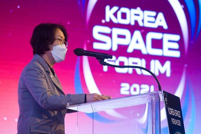 [서울=뉴시스] 임혜숙 과학기술정보통신부 장관이 6일 서울 종로구 포시즌스호텔에서 열린 '코리아 스페이스포럼 2021' 에 참석해 개회사를 하고 있다. (사진=과학기술정보통신부 제공) 2021.12.06. photo@newsis.com *재판매 및 DB 금지