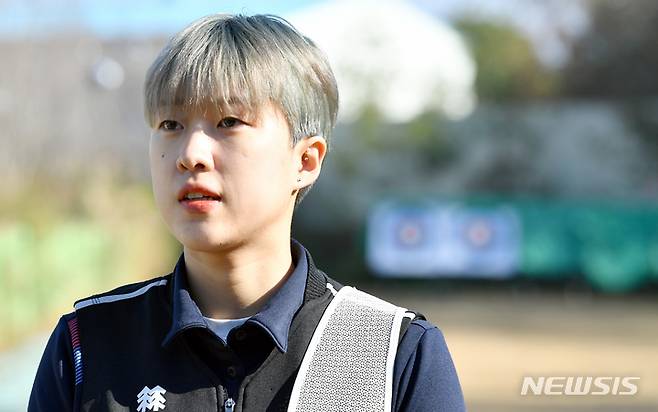 [광주=뉴시스] 류형근 기자 = 2025세계양궁선수권대회 개최지로 광주가 확정된 6일 오후 광주 광산구 광주여자대학교 양궁장에서 2020도쿄올림픽 3관왕 안산이 인터뷰를 하고 있다. 2021.12.06. hgryu77@newsis.com