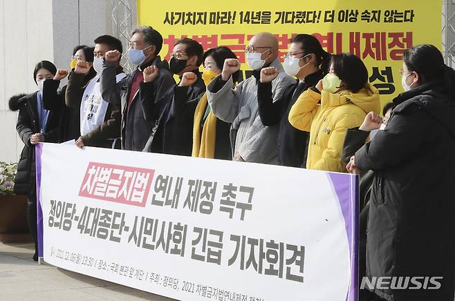 [서울=뉴시스] 최진석 기자 = 6일 오후 국회 본관 앞에서 열린 '차별금지법 연내 제정 촉구' 정의당·4대종단·시민사회 긴급 기자회견에서 정의당 심상정 대선 후보 등 참석자들이 구호를 외치고 있다. (공동취재사진) 2021.12.06. photo@newsis.com