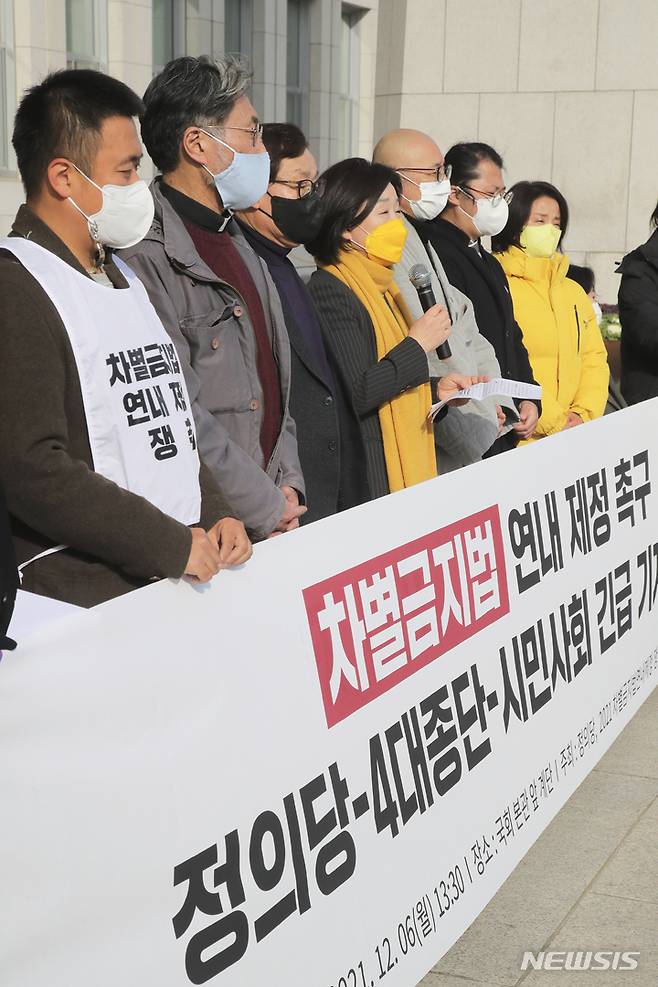 [서울=뉴시스] 최진석 기자 = 정의당 심상정(왼쪽 네번째) 대선 후보가 6일 오후 국회 본관 앞에서 열린 '차별금지법 연내 제정 촉구' 정의당·4대종단·시민사회 긴급 기자회견에서 발언하고 있다. (공동취재사진) 2021.12.06. photo@newsis.com
