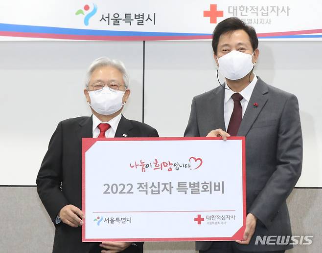 [서울=뉴시스] 조수정 기자 = 오세훈 서울시장이 6일 오후 서울시청에서 열린 2022년 적십자 특별회비 전달식에서 김흥권(왼쪽) 대한적십자사 서울지사 회장과 기념촬영 하고 있다. 2021.12.06. chocrystal@newsis.com