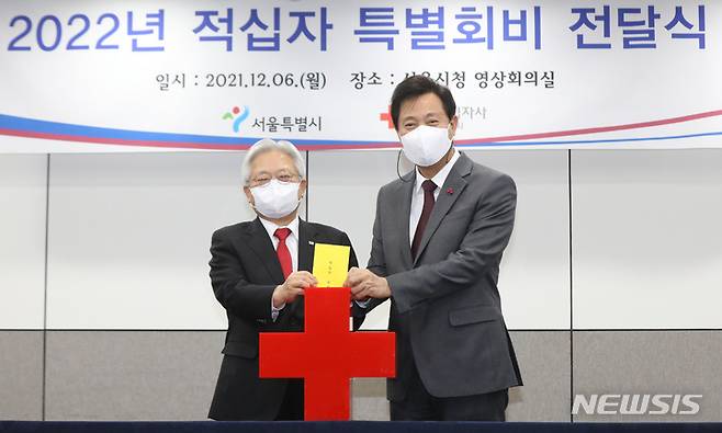 [서울=뉴시스] 조수정 기자 = 오세훈 서울시장이 6일 오후 서울시청에서 열린 2022년 적십자 특별회비 전달식에서 모금함에 봉투를 넣고 있다. 왼쪽은 김흥권 대한적십자사 서울지사 회장. 2021.12.06. chocrystal@newsis.com