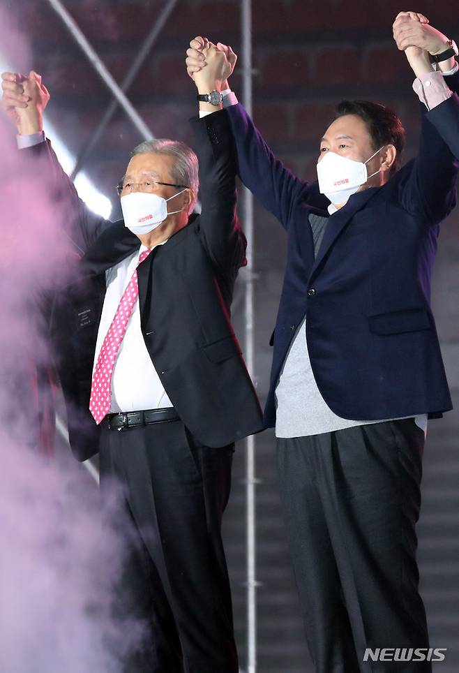 손 맞잡은 국민의힘 윤석열 대선 후보-김종인 총괄선대위원장