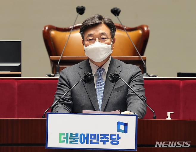[서울=뉴시스] 김선웅 기자 = 윤호중 더불어민주당 원내대표가 6일 오후 서울 여의도 국회에서 열린 정책의원총회에서 모두발언 하고 있다. (공동취재사진) 2021.12.06. photo@newsis.com
