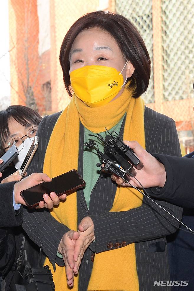 [서울=뉴시스] 국회사진기자단 = 심상정 정의당 대선 후보가 6일 오후 서울 여의도 켄싱턴호텔로 안철수 국민의당 대선 후보와 회동하기 위해 들어가며 취재진의 질문에 답하고 있다. 2021.12.06. photo@newsis.com