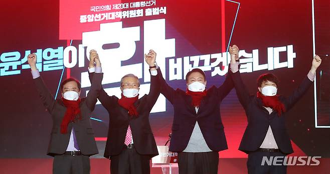 [서울=뉴시스] 국회사진기자단 = 윤석열 국민의힘 대선 후보가 6일 서울 송파구 올림픽공원 체조경기장에서 열린 제20대 대통령선거 중앙선거대책위원회 출범식에서 대선 승리를 기원하며 빨간 목도리를 두르고 잡은 손을 들어보이고 있다. 왼쪽부터 김병준 상임선대위원장, 김종인 총괄선대위원장, 윤 후보, 이준석 상임선대위원장. 2021.12.06. photo@newsis.com