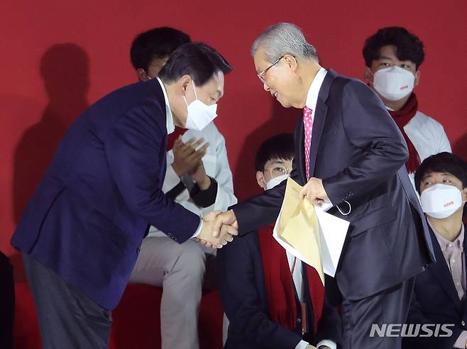 [서울=뉴시스] 국회사진기자단 = 윤석열 국민의힘 대선 후보가 6일 서울 송파구 올림픽공원 체조경기장에서 열린 제20대 대통령선거 중앙선거대책위원회 출범식에서 인사말을 마친 김종인 총괄선대위원장과 악수하고 있다. 2021.12.06. photo@newsis.com