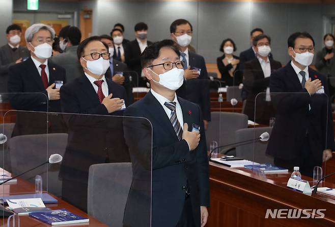 [서울=뉴시스] 김명원 기자 = 박범계 법무부 장관, 고승범 금융위원장 및 참석자들이 6일 서울 종로구 정부서울청사 별관에서 열린 공정경제 성과보고대회에 참석해 국민의례를 하고 있다. 2021.12.06. kmx1105@newsis.com
