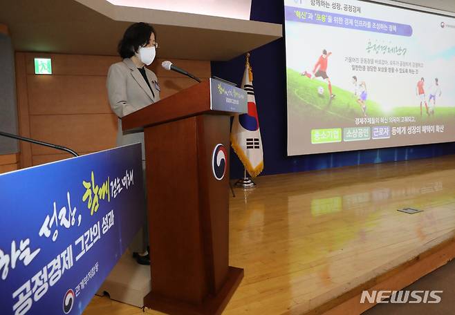 [서울=뉴시스] 김명원 기자 = 조성욱 공정거래위원장이 6일 서울 종로구 정부서울청사 별관에서 열린 공정경제 성과보고대회에 참석해 종괄보고를 하고 있다. 2021.12.06. kmx1105@newsis.com