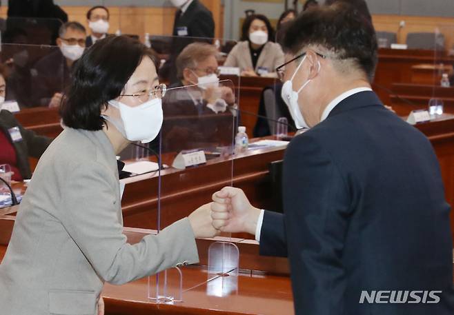 [서울=뉴시스] 김명원 기자 = 조성욱(왼쪽) 공정거래위원장과 박범계 법무부 장관이 6일 서울 종로구 정부서울청사 별관에서 열린 공정경제 성과보고대회에 참석해 인사하고 있다. 2021.12.06. kmx1105@newsis.com