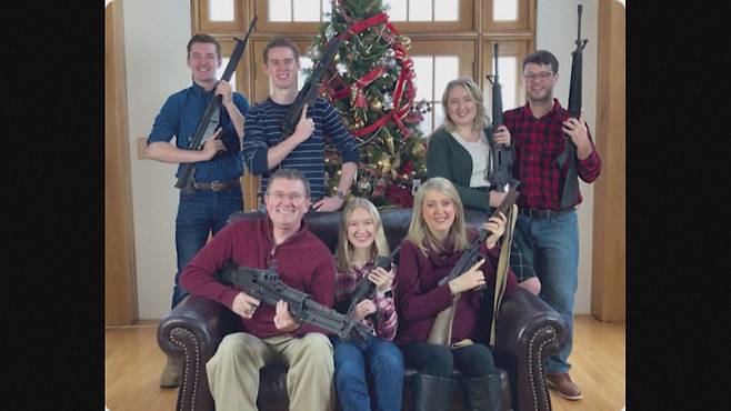크리스마스 트리를 배경으로 모인 남녀 7명이 두 손에 각각 총 한 자루씩을 들고 있습니다. 이 SNS의 사진 (아래)속 인물들은 가족입니다.