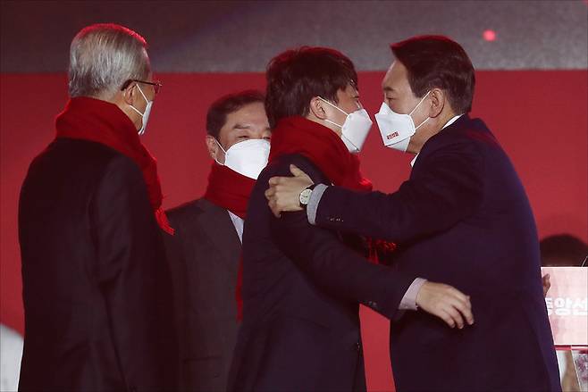 [서울=뉴시스] 국회사진기자단 = 윤석열 국민의힘 대선 후보가 6일 오후 서울 송파구 올림픽공원 체조경기장에서 열린 국민의힘 제20대 대통령선거 중앙선거대책위원회 출범식에서 이준석 상임선대위원장에게 대선 승리를 기원하는 빨간색 목도리를 둘러준 뒤 포옹하고 있다. 2021.12.06. photo@newsis.com