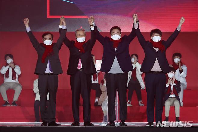 [서울=뉴시스] 국회사진기자단 = 국민의힘 윤석열(왼쪽 세번째) 대선 후보, 김종인(왼쪽 두번째) 총괄선대위원장, 김병준 상임선대위원장, 이준석(오른쪽) 상임선대위원장이 6일 오후 서울 송파구 올림픽공원 체조경기장에서 열린 국민의힘 제20대 대통령선거 중앙선거대책위원회 출범식에서 함께 손을 들어올리고 있다. 2021.12.06. photo@newsis.com