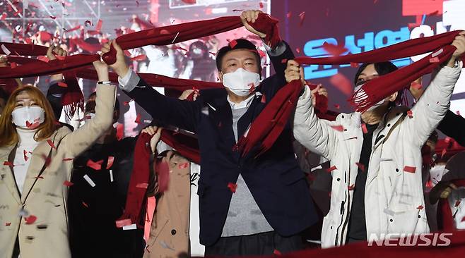 [서울=뉴시스] 국회사진기자단 = 윤석열 국민의힘 대선 후보가 6일 서울 송파구 올림픽공원 체조경기장에서 열린 제20대 대통령선거 선거대책위원회 출범식에서 후보연설을 마친 뒤 참석자들과 함께 빨간색 목도리를 흔들고 있다. 2021.12.06. photo@newsis.com