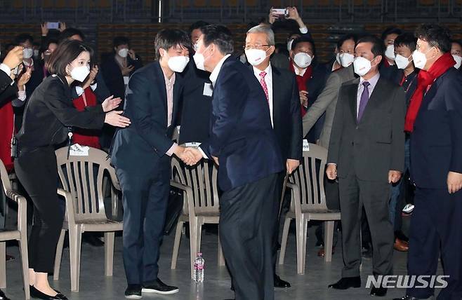 [서울=뉴시스] 국회사진기자단 = 윤석열 국민의힘 대선 후보가 6일 서울 송파구 올림픽공원 체조경기장에서 열린 국민의힘 제20대 대통령선거 선거대책위원회 출범식에서 김종인 총괄선대위원장, 김병준 상임선대위원장, 이준석 상임선대위원장과 인사하고 있다. 2021.12.06. photo@newsis.com