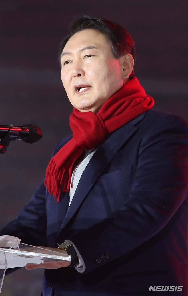 [서울=뉴시스] 국회사진기자단 = 윤석열 국민의힘 대선 후보가 6일 서울 송파구 올림픽공원 체조경기장에서 열린 제20대 대통령선거 중앙선거대책위원회 출범식에서 연설을 하고 있다. 2021.12.06. photo@newsis.com