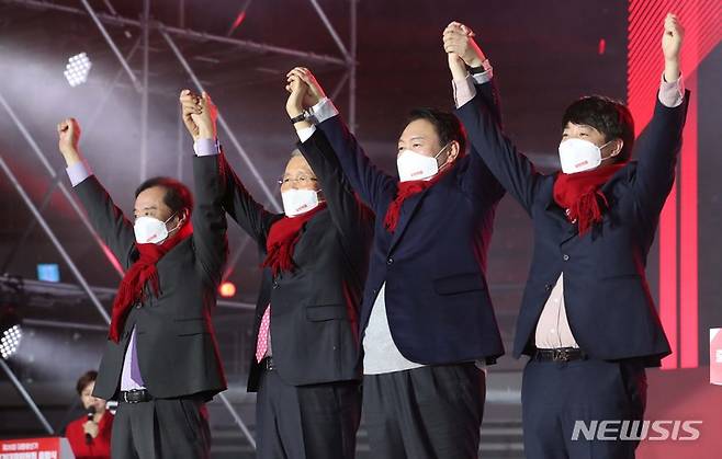 [서울=뉴시스] 국회사진기자단 = 윤석열 국민의힘 대선 후보가 6일 서울 송파구 올림픽체조경기장에서 열린 중앙선거대책위원회 출범식에서 김종인 총괄선대위원장, 이준석 상임선대위원장, 김병준 상임선대위원장과 손을 들고 있다. 2021.12.06. photo@newsis.com