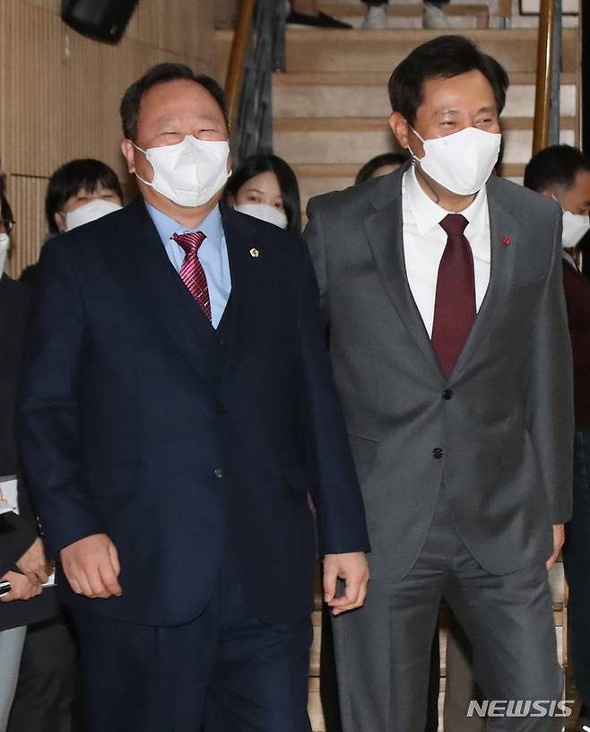 [서울=뉴시스] 조수정 기자 = 오세훈 서울시장과 김인호(왼쪽) 서울시의회 의장이 6일 오후 서울시청에서 열린 2021 서울 인권콘퍼런스 참석을 위해 대화를 나누며 나란히 입장하고 있다. 서울시의회 예산결산특별위원회(위원장 김호평)는 이날 서울시 내년도 예산안 본심사에 들어갔다. 2021.12.06. chocrystal@newsis.com