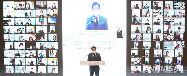 [서울=뉴시스] 조수정 기자 = 오세훈 서울시장이 6일 오후 서울시청에서 열린 2021서울 인권콘퍼런스에서 환영사 하고 있다. 2021.12.06. chocrystal@newsis.com