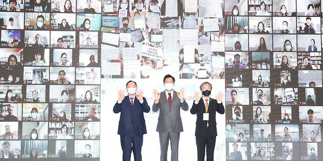 [서울=뉴시스] 조수정 기자 = 오세훈(가운데) 서울시장과 김인호(왼쪽) 서울시의회의장, 한상희 서울시인권위원회 위원장이 6일 오후 서울시청에서 열린 2021서울 인권콘퍼런스에서 온라인 참석자들과 기념촬영 하고 있다. 2021.12.06. chocrystal@newsis.com