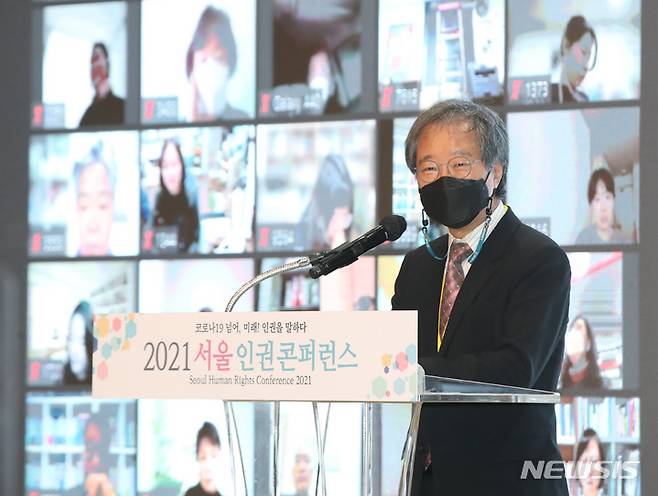 [서울=뉴시스] 조수정 기자 = 한상희 서울시인권위원회 위원장이 6일 오후 서울시청에서 열린 2021서울 인권콘퍼런스에서 축사하고 있다. 2021.12.06. chocrystal@newsis.com