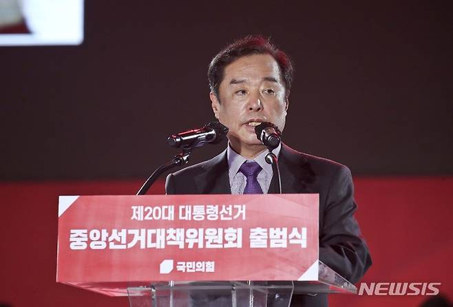 [서울=뉴시스] 국회사진기자단 = 김병준 국민의힘 상임선대위원장 6일 서울 송파구 올림픽공원 체조경기장에서 열린 국민의힘 제20대 대통령선거 중앙선거대책위원회 출범식에서 연설을 하고 있다. 2021.12.06. photo@newsis.com