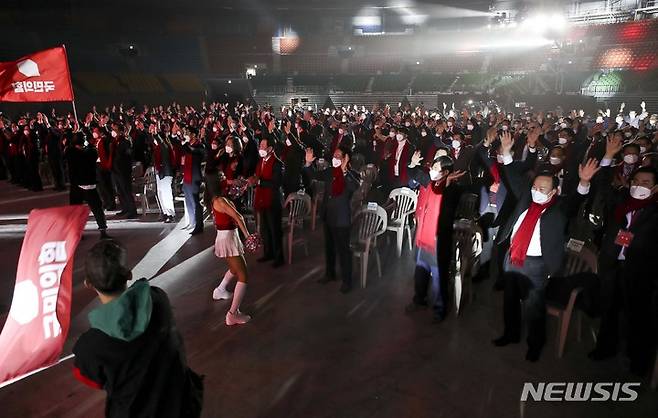 [서울=뉴시스] 국회사진기자단 = 6일 서울 송파구 올림픽공원 체조경기장에서 열린 국민의힘 제20대 대통령선거 선거대책위원회 출범식에서 참석자들이 '윤석열'을 외치고 있다. 2021.12.06. photo@newsis.com