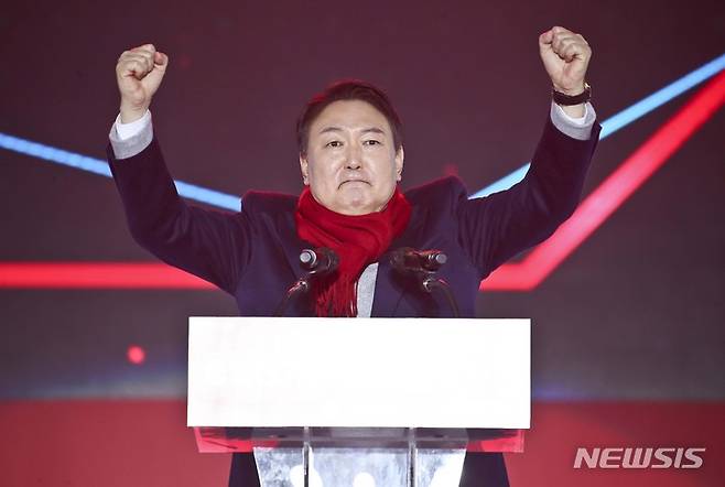 [서울=뉴시스] 국회사진기자단 = 윤석열 국민의힘 대선 후보가 6일 서울 송파구 올림픽공원 체조경기장에서 열린 제20대 대통령선거 중앙선거대책위원회 출범식에서 연설을 하고 있다. 2021.12.06. photo@newsis.com