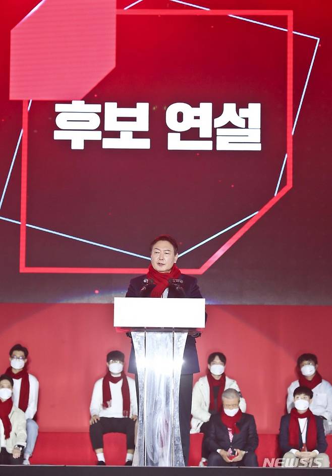 [서울=뉴시스] 국회사진기자단 = 윤석열 국민의힘 대선 후보가 6일 서울 송파구 올림픽공원 체조경기장에서 열린 제20대 대통령선거 중앙선거대책위원회 출범식에서 연설을 하고 있다. 2021.12.06. photo@newsis.com