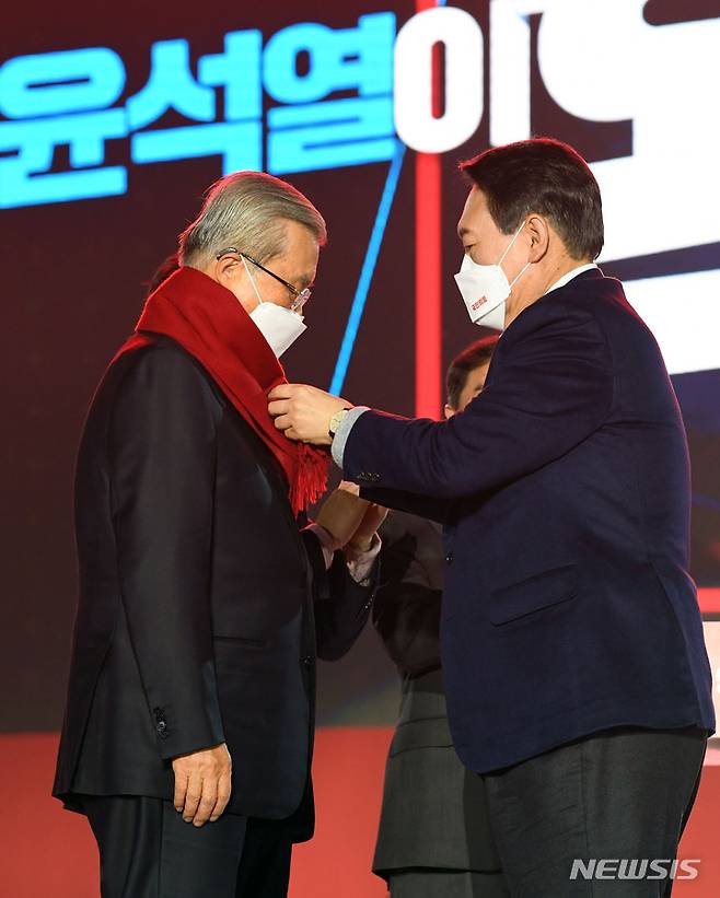 [서울=뉴시스] 국회사진기자단 = 국민의힘 윤석열 대통령 후보가 6일 서울 송파구 올림픽체조경기장에서 열린 중앙선거대책위원회 출범식에서 김종인 총괄선대위원장에게 빨간색 목도리를 둘러주고 있다. 2021.12.06. photo@newsis.com