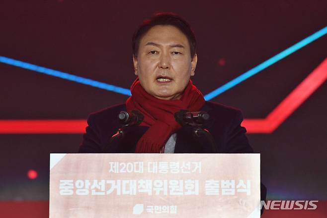 [서울=뉴시스] 국회사진기자단 = 윤석열 국민의힘 대선 후보가 6일 서울 송파구 올림픽공원 체조경기장에서 열린 제20대 대통령선거 중앙선거대책위원회 출범식에서 연설을 하고 있다. 2021.12.06. photo@newsis.com