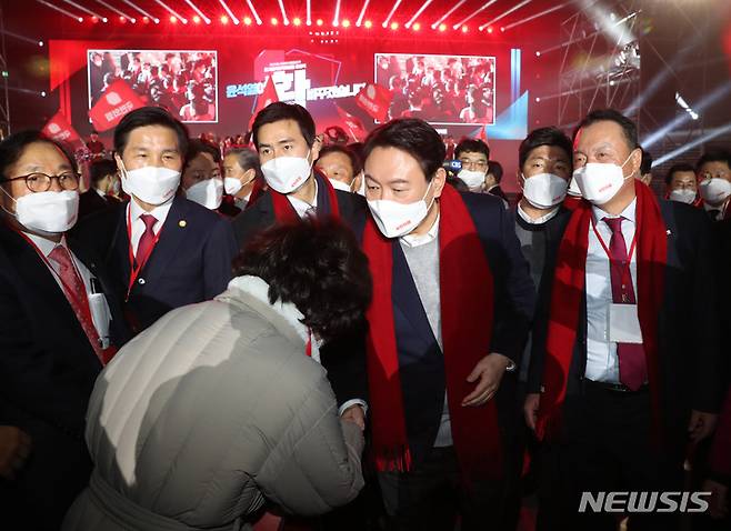 [서울=뉴시스] 국회사진기자단 = 윤석열 국민의힘 대선 후보가 6일 서울 송파구 올림픽공원 체조경기장에서 열린 제20대 대통령선거 중앙선거대책위원회 출범식을 마친 뒤 참석자들과 인사하고 있다. 2021.12.06. photo@newsis.com