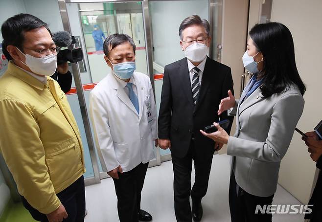[인천=뉴시스] 국회사진기자단 = 이재명 더불어민주당 대선후보가 6일 오후 인천시 동구 인천의료원 음압병동을 찾아 신현영 의원과 대화하고 있다. 오른쪽부터 신현영 의원, 이재명 후보, 조승연 인천의료원장, 박남춘 인천광역시장. 2021.12.06. photo@newsis.com