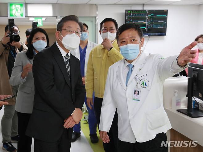 [인천=뉴시스] 국회사진기자단 = 이재명(왼쪽) 더불어민주당 대선후보가 6일 오후 인천시 동구 인천의료원 음압병동을 찾아 조승연 원장의 설명을 듣고 있다. 2021.12.06. photo@newsis.com