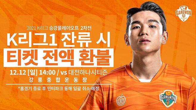 강원은 오늘(6일) '잔류 시 환불' 이벤트로 승강 PO를 홈 팬과 함께한다고 밝혔습니다.