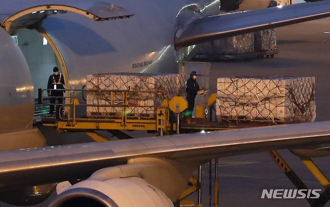 [인천공항=뉴시스] 이영환 기자 = 개별 계약한 코로나19 화이자 백신 248만3000회분이 6일 오후 인천국제공항 화물터미널에 도착해 백신수송 관계자들이 수송작업을 하고 있다. 2021.12.06. 20hwan@newsis.com