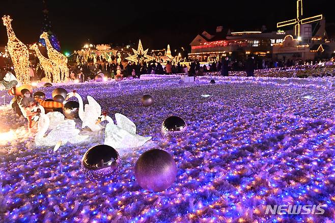 [용인=뉴시스] 김종택기자 = 6일 오후 경기도 용인 에버랜드 포시즌 가든에서 열린 '윈터 위시스' 겨울 콘텐츠에서 관람객들이 반짝이는 조명을 바라보며 추억을 남기고 있다. 에버랜드 윈터 위시스는 코로나19로 힘든 상황을 함께 이겨내고 있는 가족, 친구, 의료진 등에게 감사와 희망의 메시지를 보내는 골든 일루미네이션 가든 부터 크리스마스 판타지까지 다채로운 콘텐츠가 펼쳐졌다. 2021.12.06.