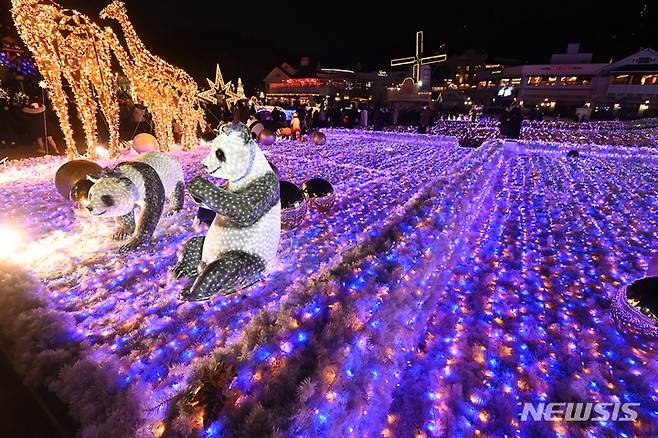 [용인=뉴시스] 김종택기자 = 6일 오후 경기도 용인 에버랜드 포시즌 가든에서 열린 '윈터 위시스' 겨울 콘텐츠에서 관람객들이 반짝이는 조명을 바라보며 추억을 남기고 있다. 에버랜드 윈터 위시스는 코로나19로 힘든 상황을 함께 이겨내고 있는 가족, 친구, 의료진 등에게 감사와 희망의 메시지를 보내는 골든 일루미네이션 가든 부터 크리스마스 판타지까지 다채로운 콘텐츠가 펼쳐졌다. 2021.12.06.