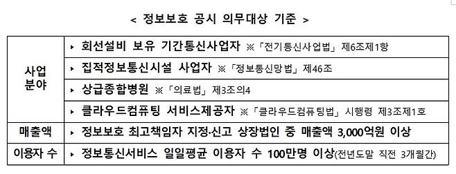 개정안에 따르면 정보보호 공시 의무대상 기준은 ▲정보보호최고책임자(CISO) 지정·신고 상장법인 중 전년도 매출액 3000억원 이상 기업 ▲정보통신서비스 일일평균 이용자 수 100만명 이상(전년도말 직전 3개월간) 기업 ▲회선설비 보유 기간통신사업자 ▲집적정보통신시설 사업자 ▲상급종합병원 ▲클라우드컴퓨팅 서비스제공자 등이다.