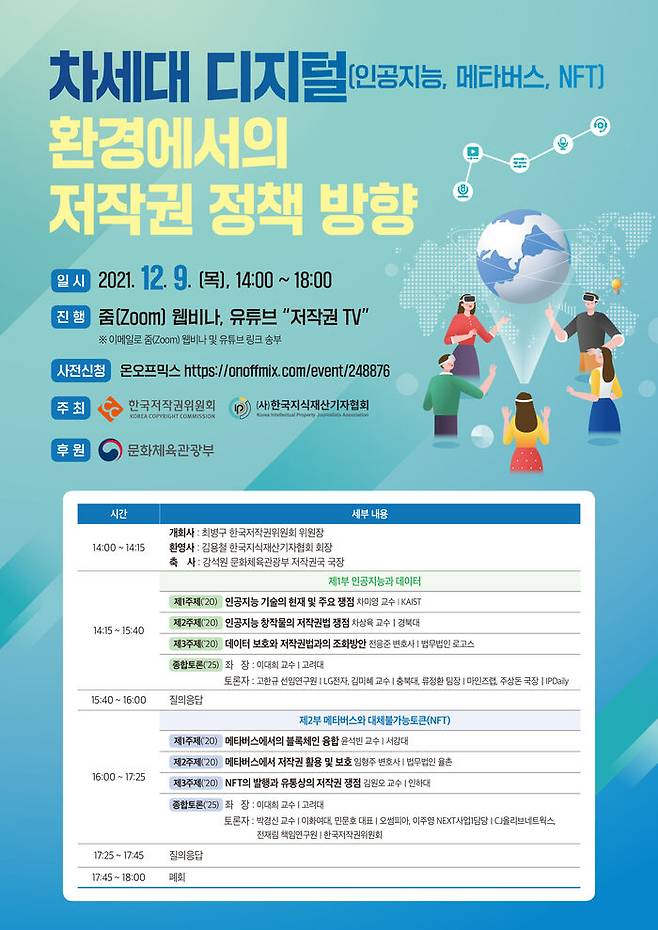 또 메타버스로 대표되는 가상공간에서 캐릭터 등 저작물의 이용 시 저작권을 효과적으로 보호할 수 있는 방안과 함께 창작물에 대해 대체불가능코인(NFT)을 발행해 유통하는 저작물 유통 환경의 변화에 대처한 법과 제도의 정비 방안도 논의합니다.