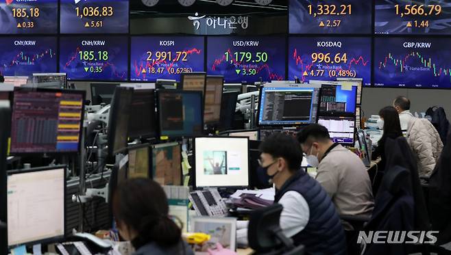 [서울=뉴시스] 추상철 기자 = 코스피와 코스닥지수가 동반 소폭 상승 마감한 7일 오후 서울 중구 하나은행 딜링룸 전광판에 코스피 지수가 전 거래일에 비해 18.47(0.62%) 포인트 오른 2991.72를 코스닥은 4.77(0.48%) 포인트 오른 996.64를 나타내고 있다. 2021.12.07. scchoo@newsis.com