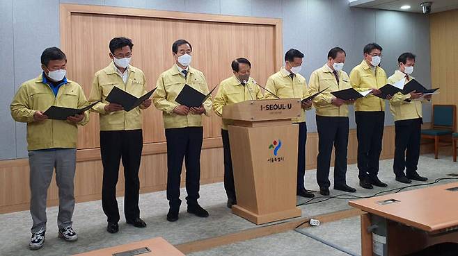 이날 회견은 구청장이 사퇴해 권한대행 체제로 운영 중인 종로구와 서초구를 제외한 서울 23개 자치구 구청장 공동 명의로 이뤄졌습니다.