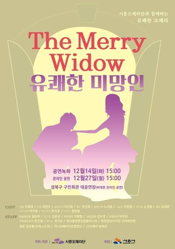 코로나로 지친 시민들의 마음에 힐링을 선사하고자 시흥오페라단이 준비한 온라인 무료 오페라공연 “유쾌한 미망인”이 12월 14일(화) 3시에 성북구민회관에서 비대면 녹화공연을 개최합니다. 녹화된 공연은 온라인을 통해 12월 27일(월) 3시에 화면에서 자막과 함께 감상 할 수 있도록 편집작업을 거처 무료로 공개 됩니다.