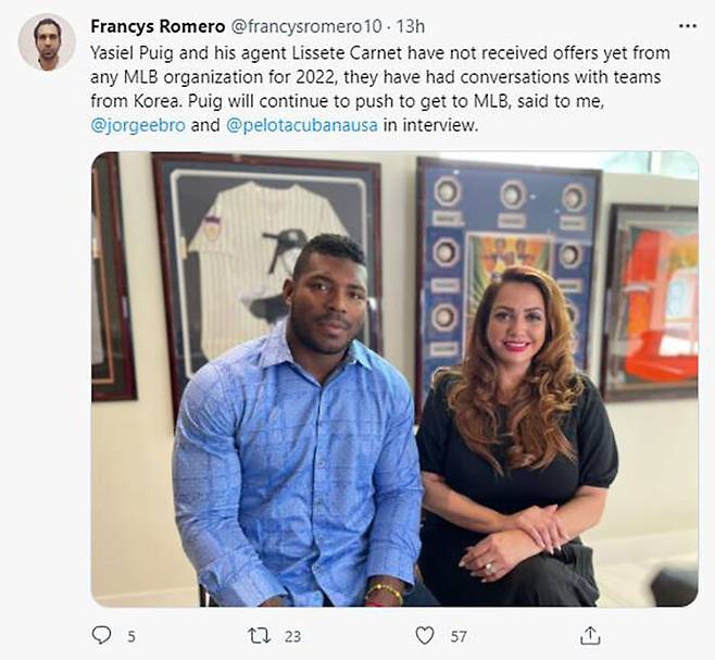 푸이그는 "KBO리그 구단이 꽤 많은 금액을 제시하며 영입 제의를 했다"며 "아직 메이저리그 구단의 제의는 받지 못했다. 스프링캠프가 열릴 때까지는 KBO리그 구단의 제의에 응하지 않을 생각"이라고 말했습니다.