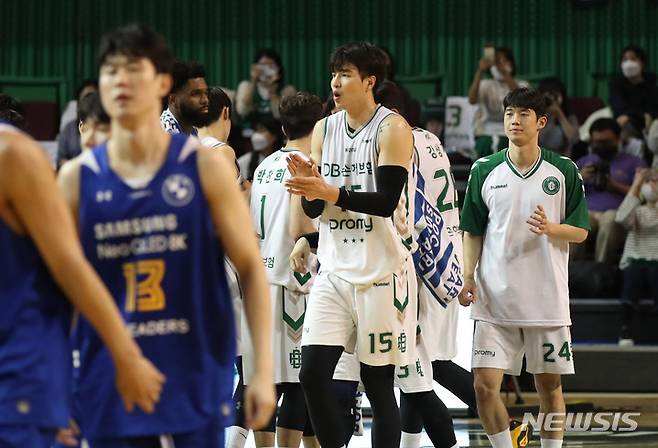 [서울=뉴시스] 고범준 기자 = 7일 오후 서울 송파구 잠실실내체육관에서 열린 2021-2022 KBL 서울 삼성 썬더스와 원주 DB 프로미 경기, 94-73 승리한 원주 김종규가 박수치며 기뻐하고 있다. 2021.12.07. bjko@newsis.com