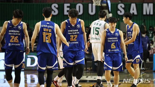[서울=뉴시스] 고범준 기자 = 7일 오후 서울 송파구 잠실실내체육관에서 열린 2021-2022 KBL 서울 삼성 썬더스와 원주 DB 프로미 경기, 94-73 패한 서울 선수들이 아쉬운 표정을 짓고 있다. 2021.12.07. bjko@newsis.com
