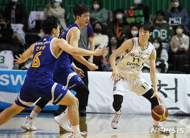 [서울=뉴시스] 고범준 기자 = 7일 오후 서울 송파구 잠실실내체육관에서 열린 2021-2022 KBL 서울 삼성 썬더스와 원주 DB 프로미 경기, 원주 정준원이 공격을 하고 있다. 2021.12.07. bjko@newsis.com