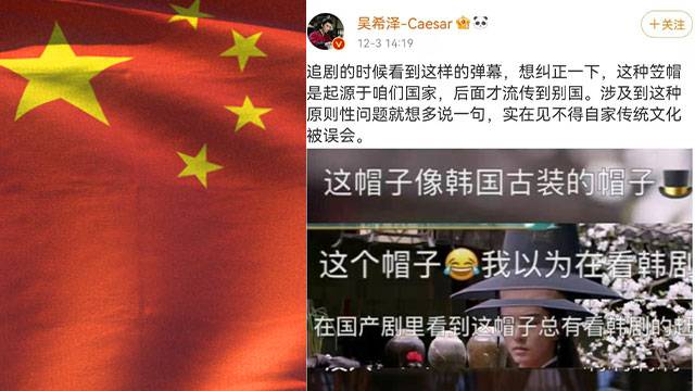 우시쩌가 한국의 갓과 유사한 형태의 모자를 쓰고 출연한 중국 사극을 본 네티즌이 캡처 이미지와 함께 중국어로 “이 모자는 한국 고대 모자와 닮았다”고 쓴 것에 대한 ‘반박 글’을 쓴 겁니다.