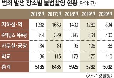 A씨처럼 직장 내에서 불법촬영을 저지르는 사람은 꾸준히 늘고 있다. 지난달 경기 안양의 한 초등학교 교장은 자신이 근무하는 초등학교 여교사 화장실에 불법촬영 카메라를 설치하고, 휴대전화로 신체 일부를 몰래 촬영한 혐의로 구속 기소됐다. 해당 교장은 파면 조치됐다. 지난 7월에는 경남 창원의 한 패스트푸드점 직원이 탈의실에서 여성 동료들이 옷을 갈아 입는 모습을 불법촬영한 혐의로 징역 3년을 선고받았다.